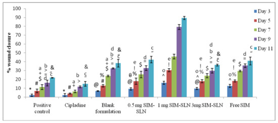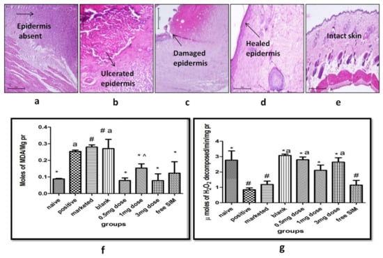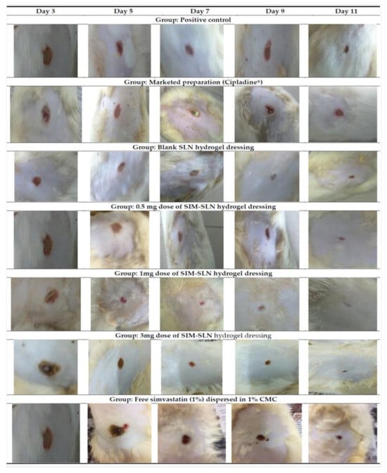 21]. Similar was observed presently as the effects produced at 1 mg dose showed faster and better healing than the 3 mg dose. Free SIM dispersed in CMC gel also showed effects, though significantly less than SIM-SLN hydrogel, on wound healing. Since the presently used excision model involves whole skin removal, the advantages obtained with improved penetration due to SLN nature are not so evident; however, the occlusion for maintaining moist conditions in the wound and porosity are a definite advantage. Though histology and rate of wound healing was monitored along with the oxidative stress markers i.e., MDA and catalase, it will be appropriate to conduct more elaborate studies like monitoring various molecular markers of inflammation, healing, angiogenesis, and various genetic markers to more elaborately establish the mechanism of action. Apart from appropriate safety, efficacy, and patient compliance, it will also be worthwhile and of scientific interest to study the structural aspects of present formulation in depth and develop a clearer insight and understanding of its mechanical properties and sub-atomic structure.