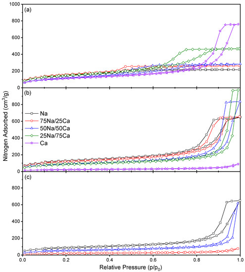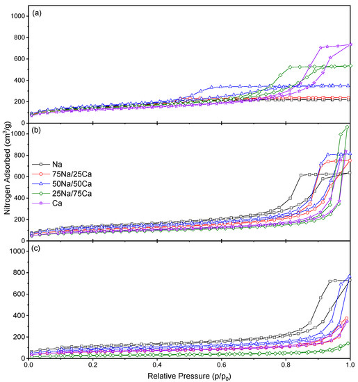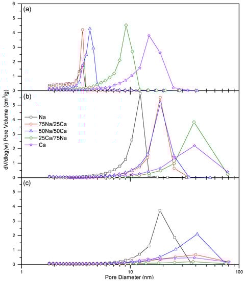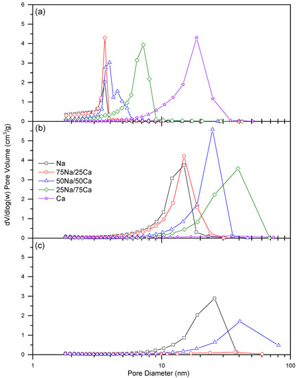 Changes in the closure point of the hysteresis loop can be ascribed to the experimental technique itself used for the Na-rich xerogels, while effects from the solid sorbent are influential for the higher calcium loadings. This is due to the fact that the closure point of a hysteresis loop occurs at a given relative pressure and temperature for a known adsorptive; for nitrogen, this point occurs at p/po ~0.42 [22] at −196 °C. The closure point moves toward higher p/po as the calcium content increases; hence, the observed behaviour becomes more characteristic of the material than the adsorptive. Type H2 hysteresis loops are indicative of ‘ink-bottle’ shaped pores and are evidence of differences in condensation and evaporation mechanisms. Hence, the porous structure of the material is likely similar in shape, but the dimensions of the pores are affected. Figure 3 shows the progressive widening of the pore size distributions across all three R/C ratios. It is also notable from Figure 3, and Table 2, that the average pore diameter increases as %Ca increases; this is expected, as the amount of influence from the Group II metal carbonate will increase with concentration.