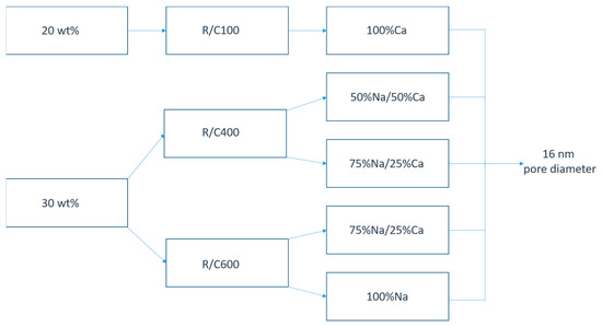 It is evident that the simultaneous addition of Na and Ca produces cluster sizes between those obtained for the individual catalysts, as previously reported [18]. The results obtained here would suggest that similar trends in pore control could be obtained using other combinations; for example, previous work has shown that calcium and barium carbonates create similar final xerogels [18], hence the influence of other Group II species may also result in the moderation of the Group I catalysts. It is also clear that, as the proportion of each cation increases, there is a shift towards the dominant character of the pure gel of that catalyst; however, for the mixed catalyst xerogels, the dominance of Na decreases as the R/C increases, and it is possible to increase the surface areas and pore volumes while maintaining pore size, which has implications for the synthesis of tailored materials and final properties. In these cases, more Ca character develops in the gel; however, it should be noted that there can be issues with solubility for CaCO3, affecting the amount of the catalyst that can be used. It has also been reported that the constantly evolving conditions within the reaction volume may affect catalyst solubility, and it is recognised that increased temperature is unfavourable for solubility [23,24]. For the xerogels studied here, there are limited differences between the 20% w/v and 30% w/v xerogels, which indicates that solubility is not a strong influence within this particular study. Higher R/C xerogels also exhibit larger pore sizes and volumes, which presents a new avenue for tuning these materials to selected applications, including their use in soil amendments, within fuel cells, or in technologies for CCS [25], air separation [26], water treatment [27], electrochemical processes [28], and hydrogen storage [29], including the use of doped variants for enhanced interaction [30].