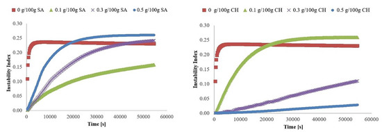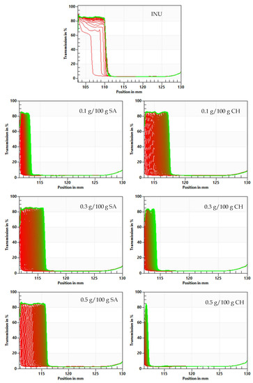 The “fingerprint” transmission profiles reflect the changes in a particle’s concentration inside the analyzed sample based on the STEP technology (space-time resolved extinction profiles). The evolution of extinction profiles’ “fingerprints” contains detailed information on the kinetics of concentration changes caused by phase separation. Low transmission indicates a high particle concentration, whereas high transmission indicates a low particle concentration. By examining the transmission profile (Figure 3), the destabilization behavior of hydrogels was investigated. The transmission profiles of all of the tested hydrogels had a similar shape (transmission at 80%), indicating that particles were moving towards the bottom of the sample because of the particle compression process. Based on the transmission profiles, it can be concluded that the compression process occurred the fastest in the control sample due to the weak inulin hydrogel structure. This finding is in accordance with other research on the stability of inulin hydrogels [11,32]. In the samples with the addition of 0.1 g/100 g CH, 0.3, and 0.5 g/100 g SA the sedimentation process was at a slower rate than in the case of the INU hydrogel (control sample). The slowest particles movement was observed in inulin hydrogel with the addition of 0.5 g/100 g CH, whereas the addition of 0.3 g/100 g CH and 0.1 g/100 g SA showed a similar effect on the sedimentation rate.