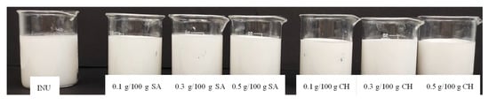 It was discovered that the incorporation of SA as well as CH, regardless of concentration, had no effect on the gel forming ability of inulin. Under the studied circumstances (20 g/100 g INU, 0.1, 0.3, 0.5 g/100 g of SA and CH, respectively), the obtained water suspension developed a homogenous hydrogel structure (VGI = 100%, Table 1).