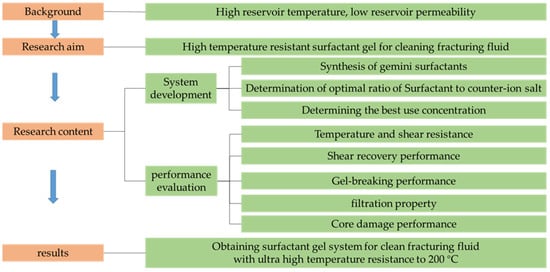 In recent years, low permeability reservoir has become an important strategic energy resource []. However, these reservoirs have the characteristics of low permeability, which makes the development of these reservoirs challenging. Asphaltene control technology can reduce the damage of deposited asphaltenes to reservoir permeability and increase oil production [,]. Hydraulic fracturing technology is an important method to improve the production capacity of low-permeability oil reservoirs [,]. Fracturing fluid is the key factor of fracturing success. In the past few decades, soluble polymers, such as guar gum and acrylamide polymer, have been widely used as thickeners in fracturing fluids [,,]. However, with the gradual transfer of oilfield development to deeper and tight reservoirs, decreasing the reservoir damage rate becomes particularly important [,]. Traditional polymer fracturing fluid easily produces insoluble residues after gel breaking, which will block the oil and gas migration channel and lead to low production of oil wells. Thus, low-damage fracturing fluid is paid more and more attention in low permeability and tight reservoir development [,]. As shown in Figure 1, viscoelastic surfactant (VES) can spontaneously form viscoelastic surfactant gel in aqueous solution to increase the viscosity of the solution, which are generally called “living polymer systems” [,,,,]. In recent years, viscoelastic surfactant gels have often been used as clean fracturing fluids []. The viscoelastic surfactant gel without residue after gel breaking only generates a little reservoir damage [,]. In addition, the gel breaking fluid has good imbibition and oil expulsion characteristics, which has attracted the attention of the oil industry and research institutes in recent years [,,].