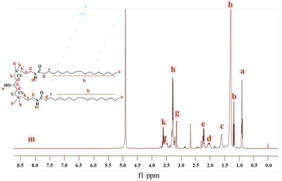 1H NMR spectra are an important method to detect the structure of organic compounds, which is an important supplement to FTIR []. The 1H-NMR spectra of GOHAC surfactant are shown in Figure 4. The 1H-NMR (Methanol-d4) data are shown as follows: δ: 3.65–3.44 (m, 8H), 3.27 (d, J = 6.3 Hz, 12H), 3.23–3.08 (m, 3H), 2.26–2.14 (m, 4H), 1.60 (p, J = 7.3 Hz, 4H), 1.31 (q, J = 6.4, 4.3 Hz, 19H), 1.28 (s, 33H), 1.17 (t, J = 7.0 Hz, 3H) and 0.94–0.86 (m, 6H).