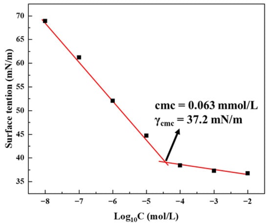 The aggregation behavior of GOHAC in ultrapure water at 25 °C was investigated using the interfacial rheometer. Figure 5 shows the surface tension of GOHAC aqueous solution at different concentrations. The results showed that the surface tension decreased with the increase in surfactant concentration. When the surfactant concentration was relatively low, the surfactant could adsorb on the gas/liquid interface. With the increase in surfactant concentration, the surface tension was decreased continuously. When the surfactant concentration reached a certain value, the surface tension value gradually remained constant. This turning point corresponded to the critical micelle concentration (cmc) value of GOHAC. It can be seen from the figure that cmc value was 0.063 mmol/L, and the corresponding surface tension was 37.2 mN/m. When surfactant concentration is higher than cmc, spherical micelles begin to form in the solution [].