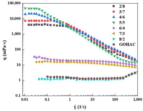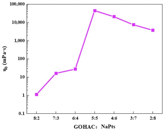 The steady shear properties of GOHAC and NaPts at different ratios were measured by fixing the total concentration of GOHAC and NaPts at 40 mmol/L, as shown in Figure 6. When the solution did not contain NaPts or contained less NaPts (GOHAC/NaPts = 8/2, 7/3, 6/4), the viscosity of the solution was close to that of water, and it was independent of the shear rate in the range of 0.01–1000 s−1. This was consistent with the characteristics of Newtonian fluid, indicating that there were only spherical micelles in the solution []. With the increase in NaPts content, the viscosity of the solution increases rapidly and the solution exhibits the characteristics of non-Newtonian fluid. Viscosity did not change with shear rate at low shear rate. This plateau value of viscosity can be regarded as zero-shear viscosity (η0) [,]. When the shear rate continued to increase, the system exhibited the typical characteristic of non-Newtonian fluid (shear thinning phenomenon). Figure 7 shows η0 at different ratios of GOHAC/NaPts. When the molar ratio of GOHAC/NaPts was 5:5, the η0 of the system reached 45 Pa·s. Compared with the pure GOHAC surfactant solution without NaPts, the η0 value increased by four orders of magnitude, indicating that the micelles grew rapidly along the one-dimensional direction [,,]. The proportion of NaPts in the system continued to increase, and it can be seen that the η0 begins to decline. The main reasons include two aspects: (1) micellar branching: intermicellar junctions formed by micelle branches can glide along the worm and act as the stress release point and the entanglement point between micelles and the elasticity of solution were reduced []. (2) Space steric hindrance: excessive NaPts can also enhance the space steric hindrance between the benzene ring and micelles, which is not conducive to the formation of network structure [].