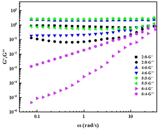 Figure 8 showed the dynamic viscoelastic curves at different ratios of GOHAC/NaPts. It can be seen that the G′ and G″ were very low when the NaPts content was less than GOHAC. G″ was greater than G′ within the frequency range of the test. Moreover, the G′ and G″ increased with the increase in oscillation frequency in the range of 0.1–100 rad/s, indicating that the micelle structure at this time showed a relative dependence on frequency. In addition, it was not difficult to find that, with the increase in NaPts, G′ and G″ increased at first and then decreased, which was consistent with the change trend of η0 of the system. When GOHAC/NaPts = 5/5, the G′ and G″ of the system had the highest values. In addition, G′ is greater than G″ within the frequency range of the test, which indicated that the system exhibited gel properties. The above experimental results showed that, when GOHAC/NaPts = 1:1, the surfactant gel system formed at this time has the best viscoelasticity []. Therefore, the optimal ratio of GOHAC/NaPts was determined to be 1:1.