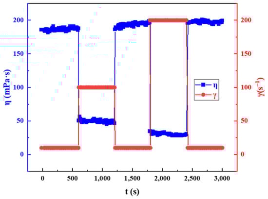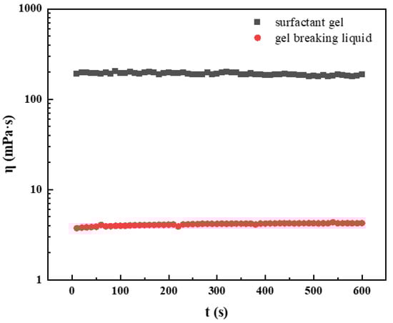 Shear recovery is one of the important indexes to evaluate fracturing fluid field application performance []. The viscoelastic surfactant gel solution in this work belonged to pseudoplastic non-Newtonian fluid. The viscosity change in the fluid was inevitable during the injection process. The rapid change in shear viscosity and poor recovery of the system are likely to cause the decrease in sand-carrying capacity of the system, so the shear recovery has become an important guarantee to ensure the successful completion of fracturing operation. In order to evaluate the shear recovery of the fracturing fluid system, two different shear rate combinations were used, 10 s−1/100 s−1 and 10 s−1/200 s−1, respectively. The shear time was set for 10 min at each shear rate to ensure the stability of the fluid viscosity test results. Furthermore, no recovery waiting time was set between the two different shear rates. The experimental results are shown in Figure 10. Under two different experimental conditions, the viscoelastic surfactant gel showed good shear recovery ability. At the shear rates of 10 s−1, 100 s−1 and 200 s−1, the apparent viscosity of the clean fracturing fluid was 178.5 mPa·s, 50.3 mPa·s and 24.7 mPa·s, respectively, which was consistent with the viscosity test results at steady shear. In addition, the viscosity of the system did not change in the shear time of 10 min, indicating that the system had good shear resistance. The system also showed obvious rapid shear recovery ability. Under the combination of 10 s−1/100 s−1 and 10 s−1/200 s−1 shear rates, the apparent viscosity of the fluid can be quickly switched. Whether the shear rate decreased rapidly from high to low or increased rapidly from low, the recovery of the apparent viscosity of the fluid had no obvious time dependence.