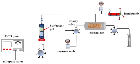According to the industry standard of water-based fracturing fluid, the filtration coefficient of the surfactant gel was carried out. The experimental device is shown in Figure 14. Before the experiment, the porosity of the core was tested after the cleaning and drying procedure. Then, the core was placed into the core holder and the container filled with the surfactant gel was also placed into the oven to start the experiment. The filtration loss pressure was set at 6.895 MPa. The timing started when liquid began to flow out of the outlet end of the core holder. The filtrate volume was recorded at 1 min, 2 min, 4 min, 9 min, 16 min, 25 min and 36 min to facilitate subsequent calculation. Finally, the flow rate, filtration viscosity and filtration coefficient were calculated according to the following Formulas (1), (2) and (3), respectively: