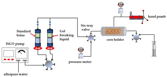 According to the industry standard of water-based fracturing fluid, the core permeability damage experiment of the prepared fracturing fluid system was carried out. The experimental device is shown in Figure 15. The experimental steps were as follows: