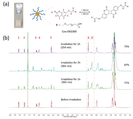When this amphiphilic compound (Cou-OEG300) was dispersed at 10 mg/mL in water, a turbid solution was obtained. The turbidity was likely due to the formation of large micelles with coumarin units in the hydrophobic core (Figure 1a). Dimerization of coumarin units leads to the formation of saturated cyclobutane rings through a [2 + 2] cycloaddition, and the progression of the coumarin dimerization was monitored by 1H NMR. Upon irradiation with 365 nm UV light from 1 h to 2 h, the integrals of distinct peaks in coumarin units, including the protons of the alkene unit (in position 1, 5 and 6) and the aromatic ring (in position 2, 3 and 4) gradually decreased (Figure 1b). Moreover, numerous new peaks appeared over time, due to the formation of different isomers of coumarin dimers [,]. The degree of dimerization of coumarin was calculated from the integral ratio of two protons in positions 6 in the Cou-OEG300 and 6′ in the dimer. Around 87% of coumarin in the model compound had dimerized after irradiation for 2 h. When the dimerized solution was irradiated with 254 nm UV light for 1 h, around 75% of dimerized coumarin groups were cleaved. These results indicate that the dimerization of coumarin groups in assembled micelle systems occurs under 365 nm UV light irradiation, and the de-dimerization process can be induced by 254 nm UV light. Therefore, the coumarin groups show potential as a reversible crosslinker for supramolecular fibers in water.