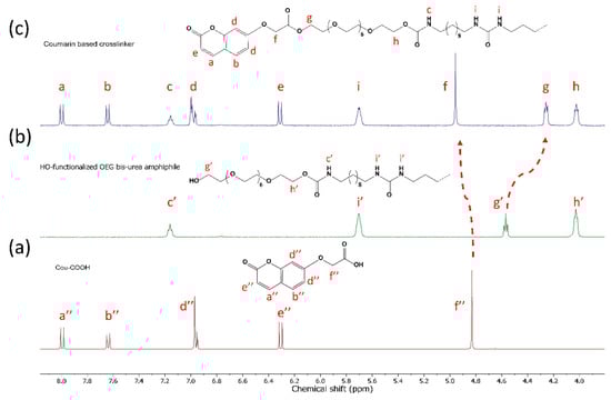 1H NMR spectra of Cou-COOH (a), HO-functionalized OEG bis-urea amphiphile (M8-10 OH) (b), and coumarin based crosslinker (Cou-crosslinker) (c) in d6-DMSO.