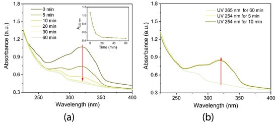 Time-dependent UV-Vis absorption spectra of 10 mg/mL OEG bis-urea amphiphile solution containing 10% Cou-crosslinker under UV light: (a) UV light 365 nm (Insert: absorbance changes at 320 nm recorded as a function of irradiation time) and (b) UV light 254 nm. The red arrows indicate change in absorbance change with time.
