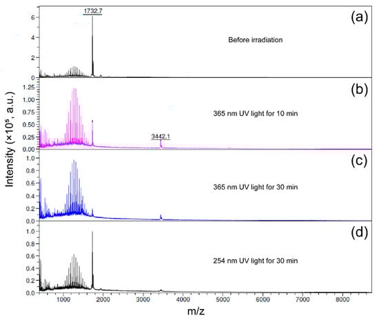 MALDI TOF MS results of the mixed solution containing 10% Cou-crosslinker before irradiation (a) and after irradiation with UV light with a wavelength of 365 nm for 10 min (b) and 30 min (c) and irradiation with UV light with a wavelength of 254 nm for 30 min (d).