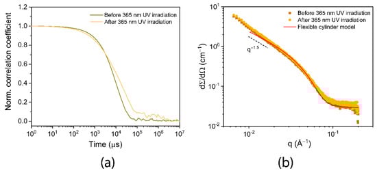 DLS ((a), 1.0 mM) and SAXS ((b), 10 mg/mL) measurements of OEG bis-urea amphiphile aqueous solution containing 10% Cou-crosslinker before and after UV irradiation (365 nm, 30 min).