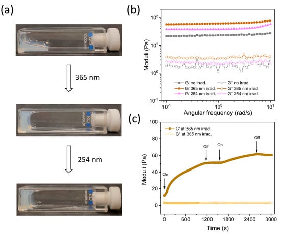 It is evident from the above experiments that the Cou-crosslinker underwent a reversible dimerization upon irradiation with different wavelengths of UV light, thus in the next step, photo-induced gelation was explored in a co-assembled mixture of OEG amphiphile with 10% of Cou-crosslinker. At a total concentration of 30 mg/mL, the mixed solution remained a viscous sol state, as determined by test tube inversion, while a self-supporting hydrogel was formed upon irradiation with UV light of 365 nm for 30 min. The gel state could not be returned to a sol state with a UV light of 254 nm for 30 min, as shown in Figure 7a; likely because the de-dimerization was incomplete. The mechanical strength of solution or gel in three different states was measured in a rheometer under oscillatory shear. As indicated in Figure 7b, the storage modulus (G′) of the mixed solution was about 16 Pa, exceeding the loss modulus (G′). Upon irradiation with 356 nm UV light, the G′ of crosslinked hydrogel increased fourfold to 66 Pa. Irradiation with 254 nm UV light for 30 min only led to a decrease of G′ to 38 Pa, confirming incomplete dissociation, in line with the observations with UV-Vis in Figure 3c.