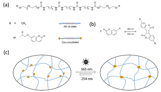 Various chemical crosslinking methods, including Diels–Alder [], [2 + 2] cycloaddition [], and boronic ester [] reactions have been widely exploited to create synthetic polymer hydrogels. Among these methods, UV light-mediated crosslinking, as a facile and versatile strategy, offers many interesting capabilities in polymer networks, such as precise spatial addressability, self-healing, and reversibility [,,]. The coumarin unit, as a photo-reversible reactive group, is ideally suited to serve as the crosslinking functionality in polymer networks. Coumarins undergo photo-dimerization via a [2 + 2] cycloaddition upon irradiation with long-wavelength UV light (>300 nm), and the dimer can be cleaved by short-wavelength UV light (<300 nm) [,,]. The photo-induced dimerization and cleavage reaction represent a reversible photo-switch, which has been used to develop photo-reversible materials for application in photovoltaic devices and tissue engineering [,,].