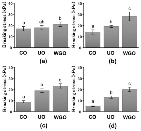 Breaking stress in okara–soybean protein isolate (SPI) gels. (a), 3% okara–SPI gels; CO, control SPI gel (15.52% SPI); UO, wet-type grinder (WG)-untreated okara–SPI gel (15.52% SPI and 0.48% WG-untreated okara); WGO, WG-treated okara–SPI gel (15.52% SPI and 0.48% WG-treated okara). (b), 5% okara–SPI gels; CO, control SPI gel (15.20% SPI); UO, WG-untreated okara–SPI gel (15.20% SPI and 0.80% WG-untreated okara); WGO, WG-treated okara–SPI gel (15.20% SPI and 0.80% WG-treated okara). (c), 10% okara–SPI gels; CO, control SPI gel (14.40% SPI); UO, WG-untreated okara–SPI gel (14.40% SPI and 1.60% WG-untreated okara); WGO, WG-treated okara–SPI gel (14.40% SPI and 1.60% WG-treated okara). (d), 15% okara–SPI gels; CO, control SPI gel (13.60% SPI); UO, WG-untreated okara–SPI gel (13.60% SPI and 2.40% WG-untreated okara); WGO, WG-treated okara–SPI gel (13.60% SPI and 2.40% WG-treated okara). Different letters indicate significant differences (p < 0.05).
