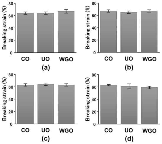 Breaking strain in okara–soybean protein isolate (SPI) gels. (a), 3% okara–SPI gels; (b), 5% okara–SPI gels; (c), 10% okara–SPI gels; (d), 15% okara–SPI gels. CO, control SPI gel; UO, wet-type grinder (WG)-untreated okara–SPI gel; WGO, WG-treated okara–SPI gel. SPI concentrations and WG-untreated and treated okara in 3%, 5%, 10%, and 15% okara–SPI gels are indicated in the Figure 1 legend.