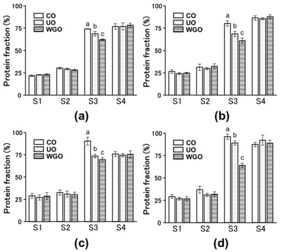 The protein solubility by homogenizing the okara–soybean protein isolate (SPI) gels in the four solutions (S1–S4). (a), 3% okara–SPI gels; (b), 5% okara–SPI gels; (c), 10% okara–SPI gels; (d), 15% okara–SPI gels. S1, 0.6 M sodium chloride (NaCl); S2, 0.6 M NaCl and 1.5 M urea; S3, 0.6 M NaCl and 8.0 M urea; S4, 1.0 M sodium hydroxide. CO, control SPI gel; UO, wet grinder (WG)-untreated okara–SPI gel; WGO, WG-treated okara–SPI gel. SPI concentrations and WG-untreated and treated okara in 3%, 5%, 10%, and 15% okara–SPI gels are indicated in the Figure 1 legend. Different letters indicate significant differences (p < 0.05).
