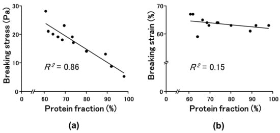 The relationship between breaking stress (a) or strain (b) and protein solubility in S3 (0.6 M NaCl and 8.0 M urea).