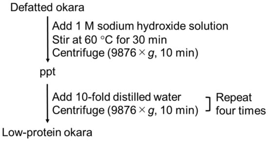 The schematic diagram of the preparation procedure for low-protein okara is shown in Figure 5. A 1 M sodium hydroxide (NaOH) solution was added to the okara and stirred at 60 °C for 30 min to elute the proteins. The alkali-treated okara was centrifuged (9876× g, 10 min) to obtain the precipitate. Next, the precipitate was centrifuged four times with 10-fold distilled water. The amount of protein was determined using the Kjeldahl method and was found to be reduced from 17.54 ± 0.72% to 2.38 ± 0.01%. For WG-treated okara preparation, the 2 wt% low-protein okara dispersion was pulverized five times using a WG (MKCA6-2, Masuko Sangyo, Kawaguchi, Japan) with a − 0.15 mm gap at 1540 rpm of the stone disk.