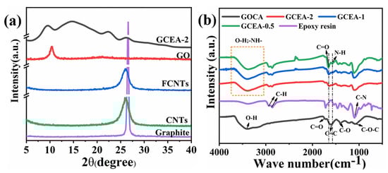 FT-IR spectra were carried out to reveal the chemical compositions of the GOCA and GCEA and epoxy resin. As shown in Figure 1b, the feature peaks of GOCA at 3386, 1720, 1620, 1405, and 1070 cm−1 were due to the vibrations of the carboxyl O-H and C=O, the C=C stretching vibrations of the aromatic rings, and vibrations of the epoxide C-O and C-O-C, respectively []. For epoxy resin, the peaks at 2933 and 2855 cm−1 were attributed to stretching vibrations of C-H in the CH2 groups, and the peak at 1096 cm−1 was attributed to stretching vibrations of C-N in the amino groups. In particular, for GCEA, the new peak appeared at 1569 cm−1 due to the N-H stretching vibration []. At the same time, the peak of the carboxylic C=O stretching vibration shifted from 1720 cm−1 to 1654 cm−1 for the GCEA, suggesting that the TETA reacted with the GO and FCNTs to form amide bonds. In addition, the intensities of the new peaks increased with the increase of content of epoxy resin, indicating that the amount of grafting onto the carrier increased with the increase of cross-linker content.