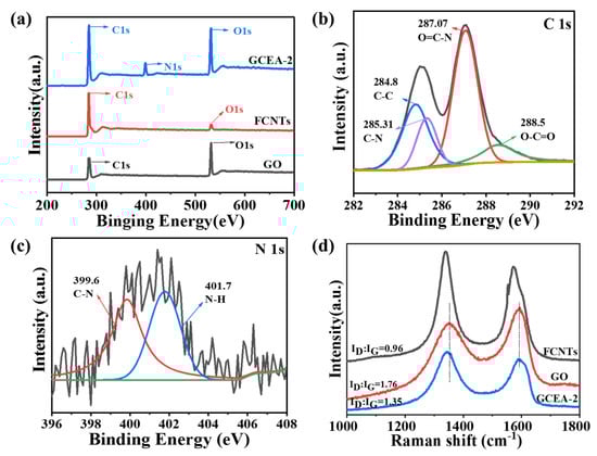 (a) XPS spectra, (b) the C1s and (c) N1s of the GCEA-2, (d) Raman spectra of GO, FCNTs, GCEA-2 (Color figure can be viewed online).