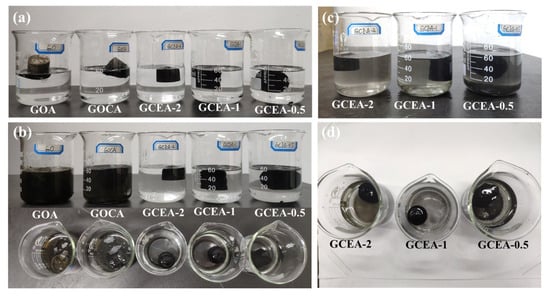 To evaluate the structural stability of the samples, they were placed in an ultrasonic environment. Compared with the GOA and GOCA, the instantaneous sedimentation rate of the GCEA in water was faster (Figure 5a). After 1 min of ultrasonic treatment at 53 kHz (Figure 5b), the structures of the GOA and GOCA were damaged, however, the GCEA remained intact. The structure of the GCEA remained intact even after 30 min of ultrasonic treatment (Figure 5c,d). The above experimental phenomena proved that GCEA has more hydrophilic and more stable structure than that of GOA and GOCA.