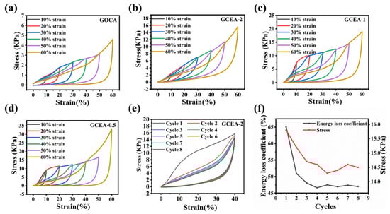 (a–d) The stress–strain curves of GOCA, GCEA aerogel at different maximum strains, (e) stress–strain curves of GCEA-2 at an extreme strain of 40% for 8 cycles, (f) energy loss coefficient and stress of carbon aerogels after repeated compression at a strain of 40% (Color figure can be viewed online).