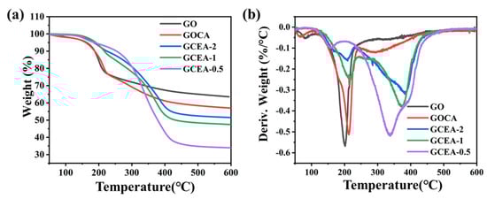 The TGA and DTG curves of the GO, GOCA, and GCEA are presented in Figure 7a,b, respectively. The main weight losses of the GO and GOCA took place at ~150–200 °C, and were attributed to the conversion of the oxygen functionalities to CO and CO2, and the evaporation of the absorbed water molecules. By contrast, the GCEA exhibited a distinct decomposition behavior, with a small mass loss at ~200 °C, followed by two major peaks at 215 °C and ~400 °C. The first major peak was attributed to the decomposition of the remaining oxygen functionalities on the GCEA, and was very similar to that of GO and GOCA. However, the weight loss corresponding to the second main peak of GCEA was much greater than that of GO and GOCA, probably due to the breakdown of epoxy groups and GCEA functional groups grafted onto the GO structure. Taken together, the results obtained via FT-IR, Raman, TGA, XPS, and XRD data analysis confirmed the successful preparation of GCEA.