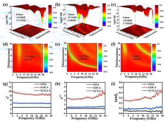 The reflection losses (RL) of the various samples in 2–18 GHz frequency range, (a–c), 2D plots (d–f) of GOA, GOCA, GCEA-2 with effective absorption bandwidth. frequency dependence of (g) ε′, (h) ε″, (i) tan δ ε (Color figure can be viewed online).