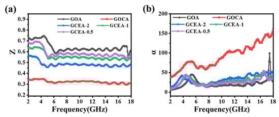Frequency dependence of (a) Z, (b) α for the samples of GOA, GOCA, and GCEA (Color figure can be viewed online).