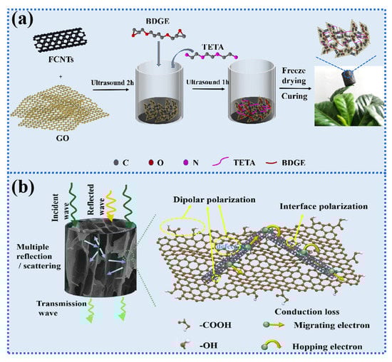 The MA mechanism can be interpreted in Figure 10b: (1) dipole polarization occurs due to the increased numbers of oxygen-containing groups and defects provided by the GO and FCNTs; (2) interfacial polarization occurs due to the difference in electrical conductivity between the interwoven FCNTs and GO; (3) the penetrating 3D interconnected network promoted the leaping of electrons, thus leading to higher conduction and reflection losses [,]. Therefore, combined the mechanical strength, structural stability, and MA properties of aerogels, GCEA was sufficient to be applied as a new 3D skeleton in the design of 3D MA materials.