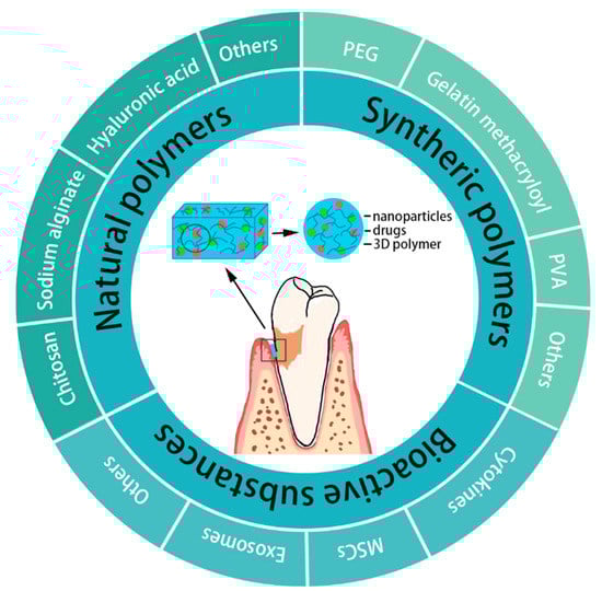 Periodontal tissue has a complex structural and compositional composition, including soft and hard tissue. Moreover, periodontitis is a chronic inflammatory disease caused by bacterial infection with an intricate pathology: pathogenic microorganisms cause inflammation of the gingiva, which overactivated the immune response and results in tissue destruction []. As the disease progresses, the host and microorganisms release a variety of proteases and proinflammatory cytokines that stimulate bone resorption []. Multiple systems, signaling pathways, and molecules are involved in the regeneration of periodontal tissue, including the skeletal, immune, and circulatory systems []. Materials with single components and structured structures are generally difficult to regenerate effectively. To simultaneously fulfill the mechanical and cell-compatible requirements of biomedical applications, multiple components must be arranged chronologically when designing material systems. As needed, hydrogel systems can carry chemicals, growth factors, nanoparticles, exosomes, and stem cells in their polymeric structure, prevent their dissolution, and provide a slow and controlled release to achieve regenerative therapy.