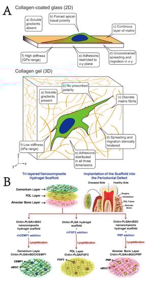 Schematic representation of (A) the different bioactive cues encountered by a cell between 2D substrates or in 3D microenvironments (Used with permission of Ref. [], permission con-veyed through Copyright Clearance Center, Inc, Danvers, MA, USA) and (B) a trilayered nanocomposite hydrogel scaffold with a similar structure of cementum-periodontium-alveolar bone for simultaneous and complete periodontal regeneration (ab: alveolar bones; pl: periodontal ligaments; d:dentin; CEMP1: cementum protein-1; FGF-2: fibroblast growth factor-2; PRP: platelet-rich plasma; nBGC: nanobioactive glass ceramic; rhCEMP1: recombinant human cementum protein-1; rhFGF: re-combinant human fibroblast growth factor) (Adapted with permission from [], Copyright 2017 WILEY‐VCH Verlag GmbH & Co. KGaA, Weinheim, Germany).