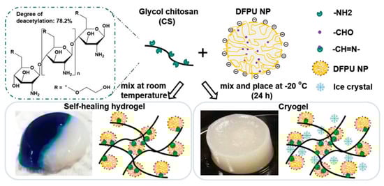 - Lin, T.W.; Hsu, S.H. Self-Healing Hydrogels and Cryogels from Biodegradable Polyurethane Nanoparticle Crosslinked Chitosan. Adv. Sci. 2020, 7, 1901388. [Google Scholar] [CrossRef] [PubMed]