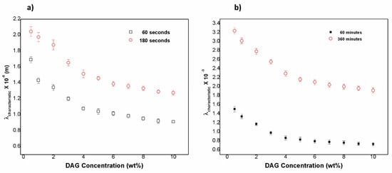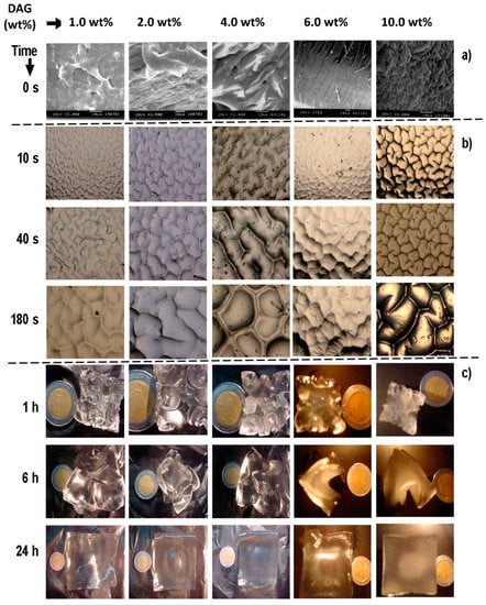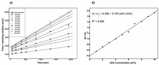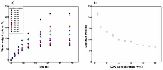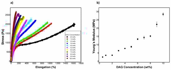 | Concentration of DAG (wt %) | Polymer Gel Fraction, GF (%) | Maximum Swelling | K × 108 | Characteristic Length, λ × 106 m | Tensile Strength (Pa) | Young’s Modulus (MPa) | Elongation at Break (%) |