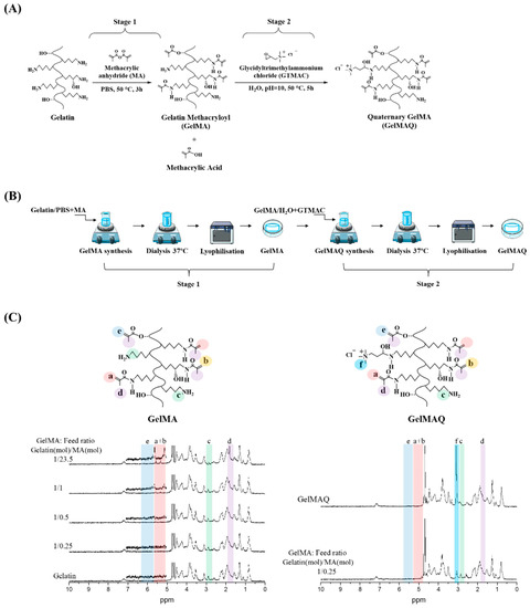 GelMAQ is a gelatin derivative synthesized from GelMA and modified with quaternary ammonium groups (-NR3+). GelMAQ synthesis was carried out in two stages as it is shown in Figure 1A, adjusting the protocols reported in the literature [35,36]. In stage 1, GelMA was synthesized by the typical reaction between methacrylic anhydride (MA) and porcine gelatin. In stage 2, GelMAQ was synthesized by the reaction between glycidyltrimethylammonium chloride (GTMAC) and GelMA. The laboratory procedure also is shown in Figure 1B.