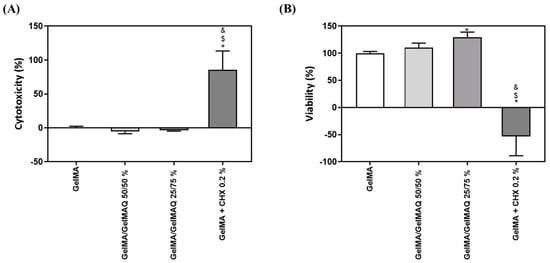 In vitro biocompatibility study of different types of GelMA on human gingival fibroblasts: (A) LDH activity, a cytotoxicity indicator, measured in culture media after the application of different types of GelMA for 48 h. Control negative (0% toxicity) was obtained from cells with GelMA. Control positive (100% toxicity) was obtained from cells cultured on plastic and treated with 1% Triton X-100; (B) metabolic activity, an indicator of the viability of cells, measured in cultured media after the application of different types of GelMA for 48 h. Control negative (100% viability of cells) was obtained from cells with GelMA. Values represent the mean ± SEM (n = 6). Results were statistically compared by ANOVA and LSD as a post hoc: * p < 0.05 treatment vs. GelMA. $ p < 0.05 treatment vs. GelMA/GelMAQ 50/50%. & p < 0.05 treatment vs. GelMA/GelMAQ 25/75%.