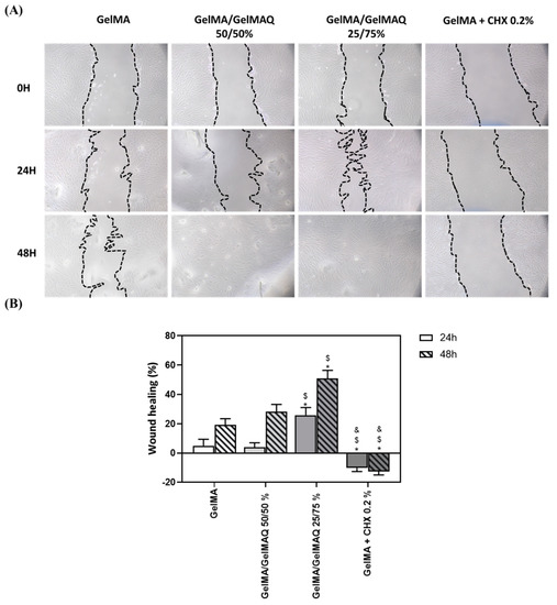 Wound healing assay after treatment with the different types of GelMA on human gingival fibroblasts: (A) images of wound healing 24 and 48 h after treatment; a magnification of 100× was used to take the images; (B) quantification of the % of wound closure area 24 h and 48 h after treatment. Quantification was performed with ImageJ. Values represent the mean ± SEM (n = 6). Results were statistically compared by ANOVA and LSD as post hoc: * p < 0.05 treatment vs. GelMA. $ p < 0.05 treatment vs. GelMA/GelMAQ 50/50%. & p < 0.05 treatment vs. GelMA/GelMAQ 25/75%.