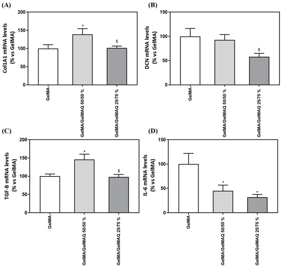 The role of fibroblasts to organize and produce ECM components in proportional amounts in accordance with healthy tissue is critical for proper wound healing [51]. Cells treated with GelMA/GelMAQ 50/50% showed a significant increase in Transforming growth factor-β1 (TGF-β1) compared to the GelMA (Figure 5C). TGF-β1 is the principal activator of collagen expression and other key components of ECM during the healing process [51], and it has also been shown to stimulate the proliferation of fibroblasts and the synthesis of proteins of extracellular matrix (ECM) [54]. Cytokines play an important role in the pathophysiology of chronic inflammatory diseases, including periodontitis. Interleukin-6 (IL-6) in particular is a major mediator of the host response to tissue injury, infection, and bone resorption. [55] IL-6 expression decreased significantly after treatment with GelMA/GelMAQ 50/50% and GelMA/GelMAQ 25/75% compared to GelMA (Figure 5D), which is interesting as it added an anti-inflammatory effect, besides its regenerative effect. IL-6 is a critical component of the acute-phase response because it triggers the release of C-reactive protein (CRP), which is involved in immune response and pro-inflammatory host reactions [56].