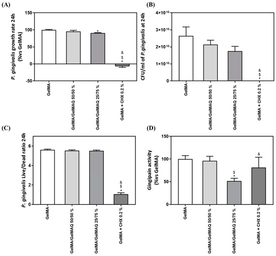 The exponential growth phase of P. gingivalis was established from 0 to 24 h of culture, to estimate the growth rate of the bacteria (Figure 6A). GelMA + CHX 0.2% produced a highly significant inhibition of bacterial growth rate compared to GelMA, GelMA/GelMAQ 50/50%, and GelMA/GelMAQ 25/75%. Furthermore, GelMA/GelMAQ 25/75% produced a slight (10%) but significant inhibition of bacterial growth rate compared to GelMA. The results also show a reduction of 33.72% in the number of UFC/mL at 24 h of the bacteria treated with the Gel that contain more GTMAC (GelMA/GelMAQ 25/75%) compared to the control, but it was not significant (Figure 6B). P. gingivalis Live/Dead ratio after 24 h with the different GelMA gels were analyzed to test their effect on bacterial survival. Figure 6C showed a significant decrease in the Live/Dead ratio on GelMA + CHX 0.2% compared to GelMA, GelMA/GelMAQ 50/50%, and GelMA/GelMAQ 25/75%, indicating a bactericidal effect of chlorhexidine, in agreement with previous reports [46].