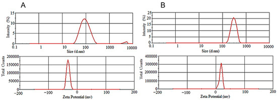 The average particle size distribution and zeta potential were assessed based on dynamic light scattering (DLS) and electrophoretic mobility, respectively, using the Zetasizer Nano ZS (Malvern Instruments, Malvern, UK) at 25 °C. Before the measurement, the formulations were diluted with filtered deionized water (1:100) to avoid the phenomenon of multiple scattering. For each sample, the results were averaged from triplicates.