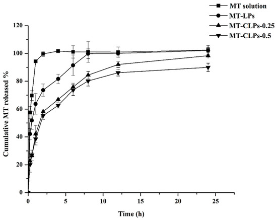 In vitro release profiles of MT-LPs, MT-CLPs-0.25, and MT-CLPs-0.5 (mean ± SD, n = 3).