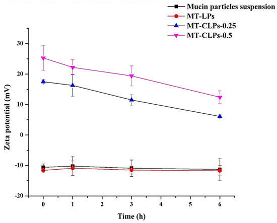 The zeta potential values of MT-LPs, MT-CLPs-0.25, and MT-CLPs-0.5 during incubation in 0.1% mucin dispersion (mean ± SD, n = 3).