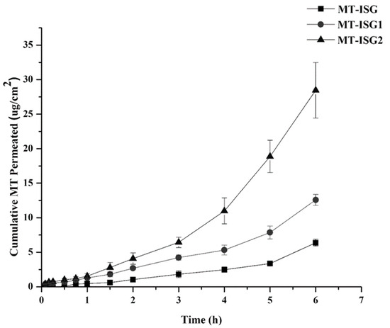 The transcorneal permeation profiles of MT-ISG, MT-ISG1, and MT-ISG2 (mean ± SD, n = 3).