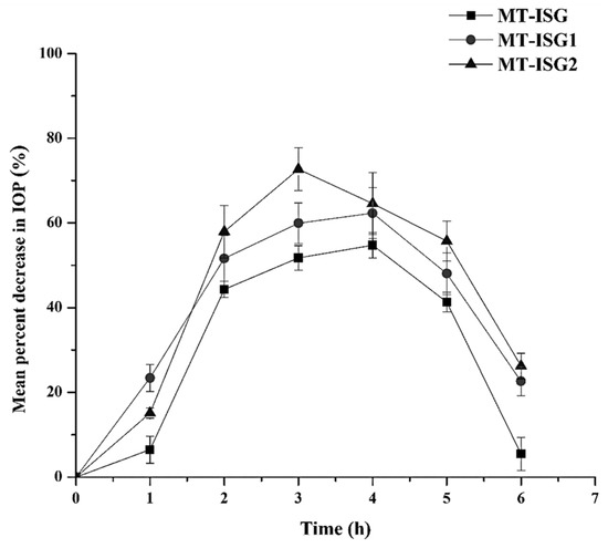 The mean percent decrease in IOP–time profiles following a single ocular dose of MT-ISG, MT-ISG1, and MT-ISG2 in rabbit eyes (mean ± SD, n = 3).