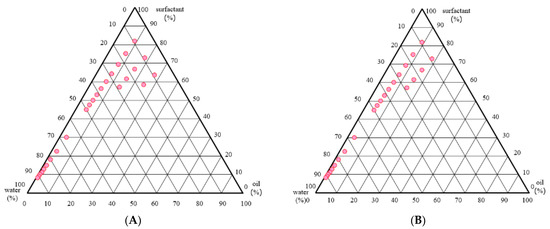 Microemulsion was formulated using pseudo-ternary phase diagrams of K. galanga rhizome oil, surfactant, co-surfactant, and water. The optimal ratio and concentration of each component that formed a clear microemulsion were obtained from a water titration method [13]. Polysorbate 80 (Tween 80®) and propylene glycol were mixed in fixed-weight ratios of 1:0, 1:1, 1:2, and 1:3. The surfactant mixtures (Smix) were added to K. galanga rhizome oil with various ratios of oil to Smix: 1:9, 2:8, 3:7, 4:6, 5:5, 6:4, 7:3, 8:2, and 9:1 (v/v). Each composition was added with ultrapure water 100 µL/time (10 times), followed by adding 1000 µL of water until the total volume reached 10,000 mL. The microemulsions containing K. galanga rhizome oil were obtained by vigorously stirring the mixtures at ambient temperature. The formation of a microemulsion was revealed by visual examination for transparency. The Smix, oil, and water ratios that resulted in transparent mixtures were represented as pink points on the phase diagram. The microemulsion’s transparency was checked again after 24 h.