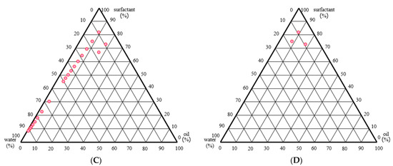 Effects of surfactant and co-surfactant on the microemulsion formation. The formulation contains (A) Tween 80® only, (B) Tween®: propylene glycol at a ratio of 1:1, (C) Tween 80®: propylene glycol at a ratio of 1:2, and (D) Tween 80®: propylene glycol at a ratio of 1:3. The pink dots represented the region of microemulsion existence.