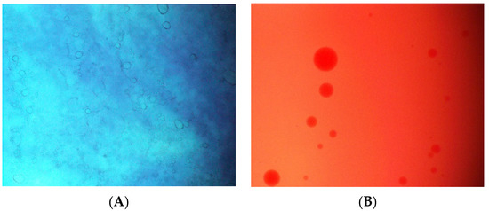 The type of microemulsion was identified by the staining method. The water-soluble dye (Brilliant blue) and oil soluble dye (Sudan IV) were used to evaluate the microemulsions’ type by staining the microemulsion droplets with the dye. K. galanga rhizome oil microemulsion stained with the dye was observed under a light microscope at 100× magnification (Olympus BX53, Olympus-Life Sciences, Tokyo, Japan). The micrographs of the microemulsion were imaged using Cellsens standard software (Olympus-Life Sciences, Tokyo, Japan). The type of microemulsion was confirmed by observing the miscibility of the microemulsion and dye. K. galanga rhizome oil microemulsion (1 mL) was placed on the glass slide. Brilliant blue or Sudan IV solutions (1 mL) were then dropped on the microemulsion. The diffusion rates of K. galanga rhizome oil microemulsion were visualized for 1 min. Sudan IV diffusion rate would be greater than that of brilliant blue when the microemulsion was of the water in oil type. When the microemulsion was oil in water, the diffusion rate of brilliant blue was higher than that of Sudan IV.